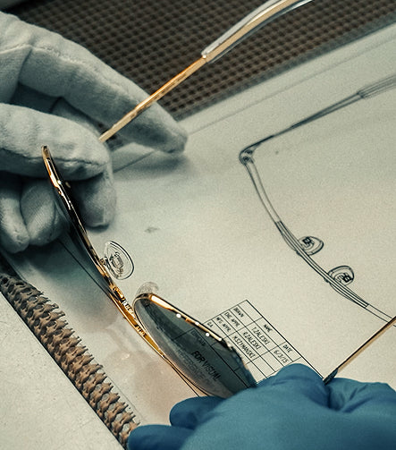 Each frame undergoes a precise temple alignment, measured against the original engineering schematic. This careful check ensures every pair fits comfortably and feels exactly as a pair of Randolph’s should.