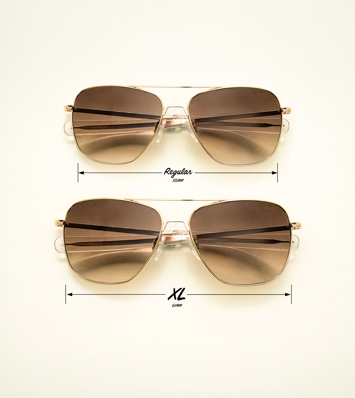 You may also use a pair of sunglasses you currently own to determine your best size. Frame sizing is typically noted on the inside of either temple. The eye size is usually first, then the bridge size, then temple size. Use the eye size to determine the best frame size. If you already wear Randolphs, you can find the eye size under the bridge of the frame.