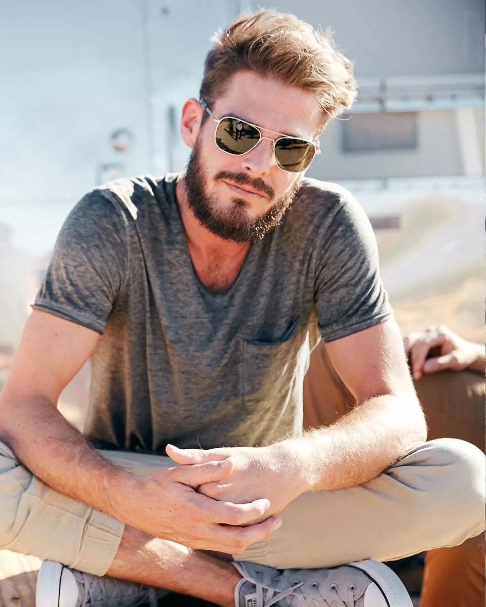 49. Jason Kelc wears Randolph Concorde sunglasses casually.